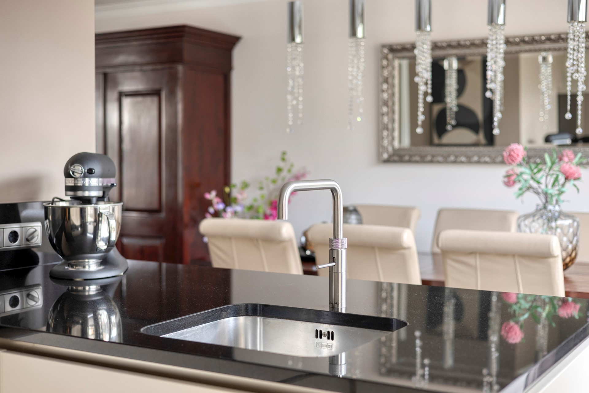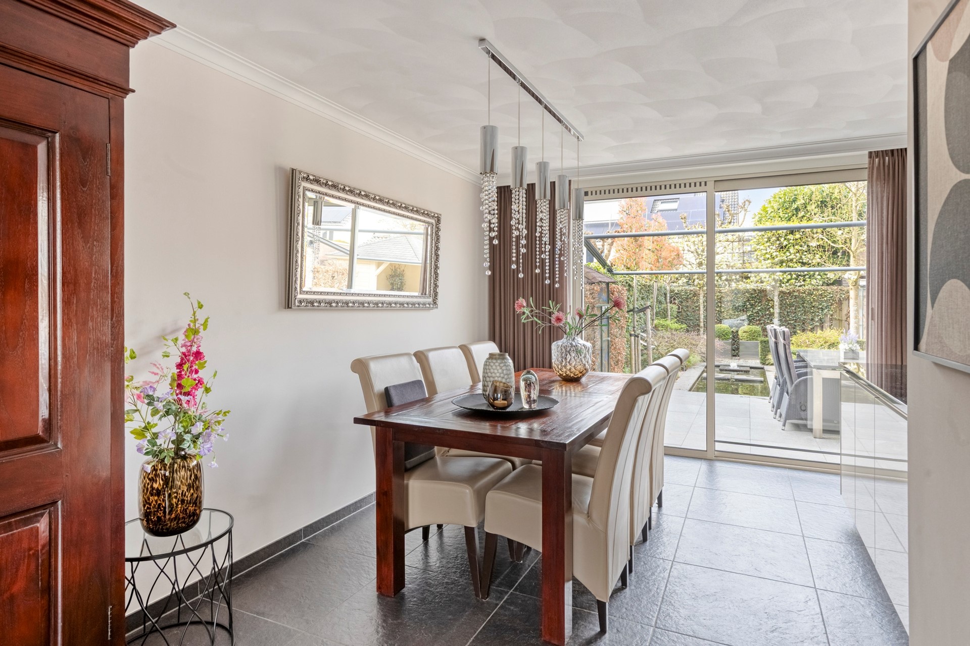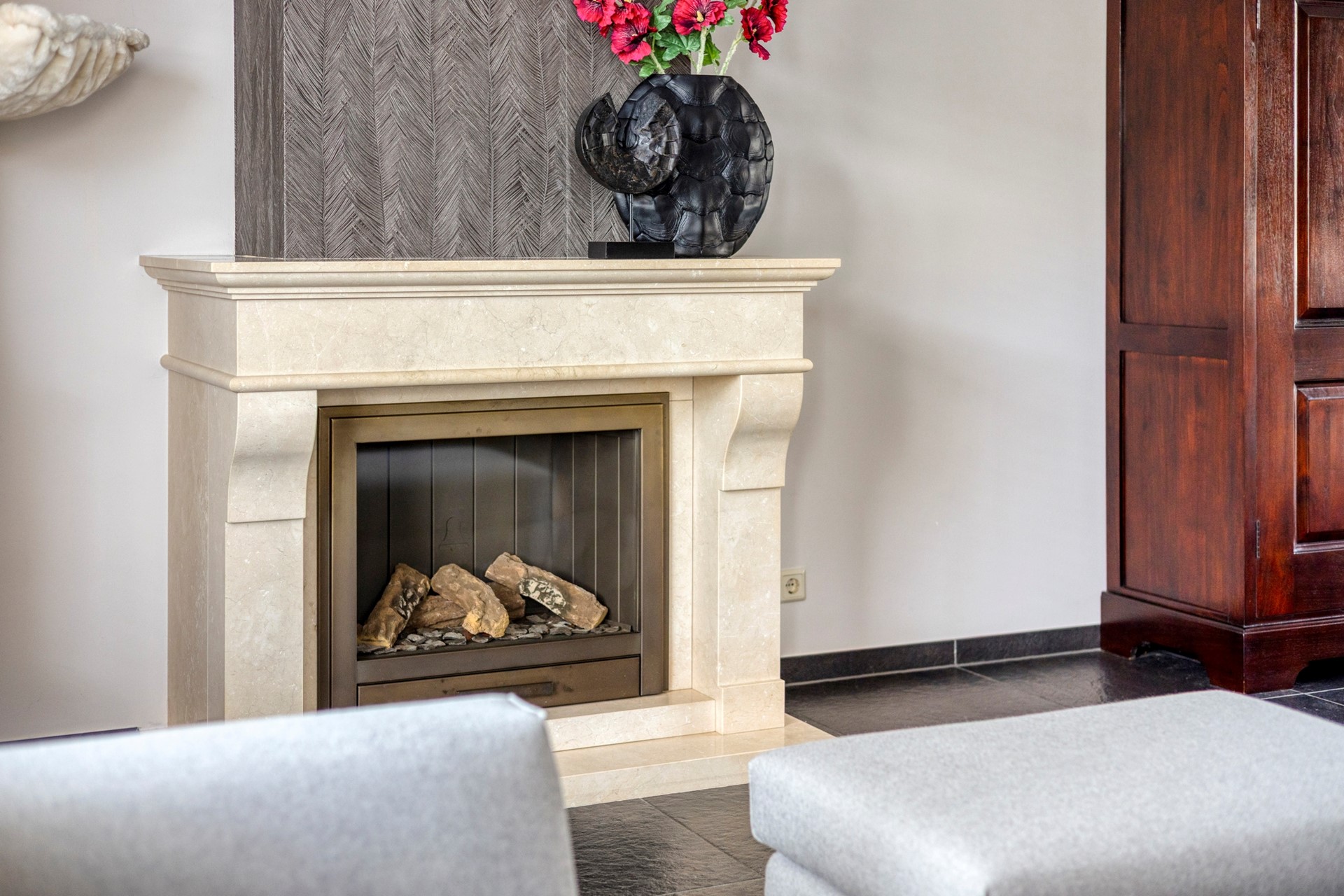 Bij binnenkomst wordt u verwelkomd in de representatieve hal, afgewerkt met een hoogwaardige natuurstenen vloer voorzien van comfortabele vloerverwarming, welke vrijwel de gehele begane grond beslaat. In de hal bevindt zich de moderne toiletruimte, uitgerust met een wandcloset en fontein. Vanuit de hal betreedt u de royale L-vormige woonkamer. De woonkamer is gesitueerd aan de straatzijde en kenmerkt zich door een prettige lichtinval. De ruimte is strak afgewerkt met gestucte wanden en plafonds en beschikt over een stijlvolle gashaard, wat zorgt voor een warme en uitnodigende sfeer. Aan de achterzijde van de woning bevindt zich de keuken, welke in open verbinding staat met de woonkamer en gericht is op de tuin. De moderne keuken is uitgevoerd in een praktische hoekopstelling met een schiereiland en afgewerkt met een luxe natuurstenen werkblad. De keuken is voorzien van diverse hoogwaardige inbouwapparatuur, waaronder een inductiekookplaat, koffieautomaat, vaatwasser, koelkast, afzuigkap en een Quooker. Middels de schuifpui in de keuken heeft u directe toegang tot de achtertuin, waardoor u optimaal kunt genieten van het binnen- en buitenleven.