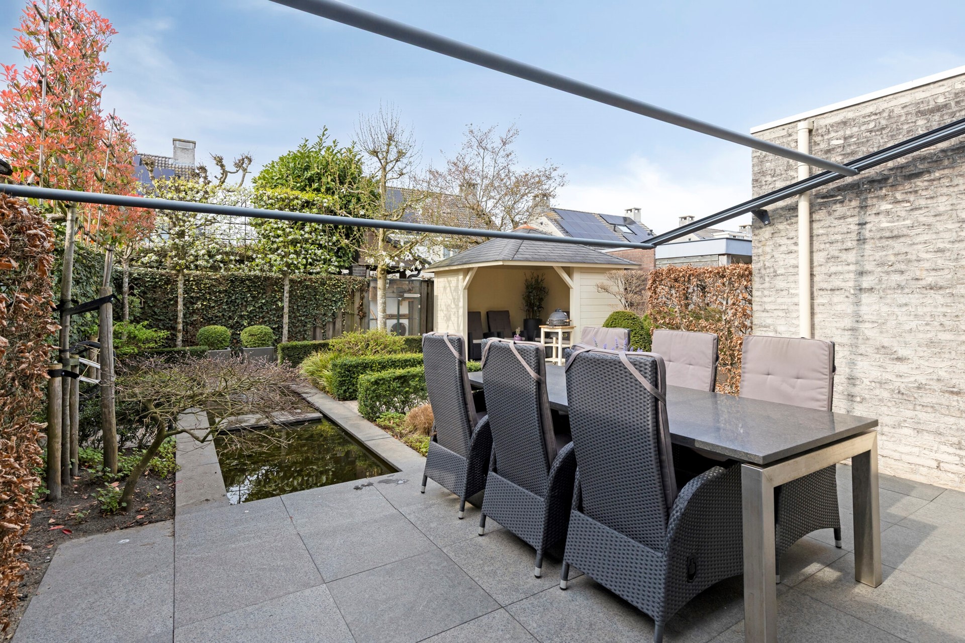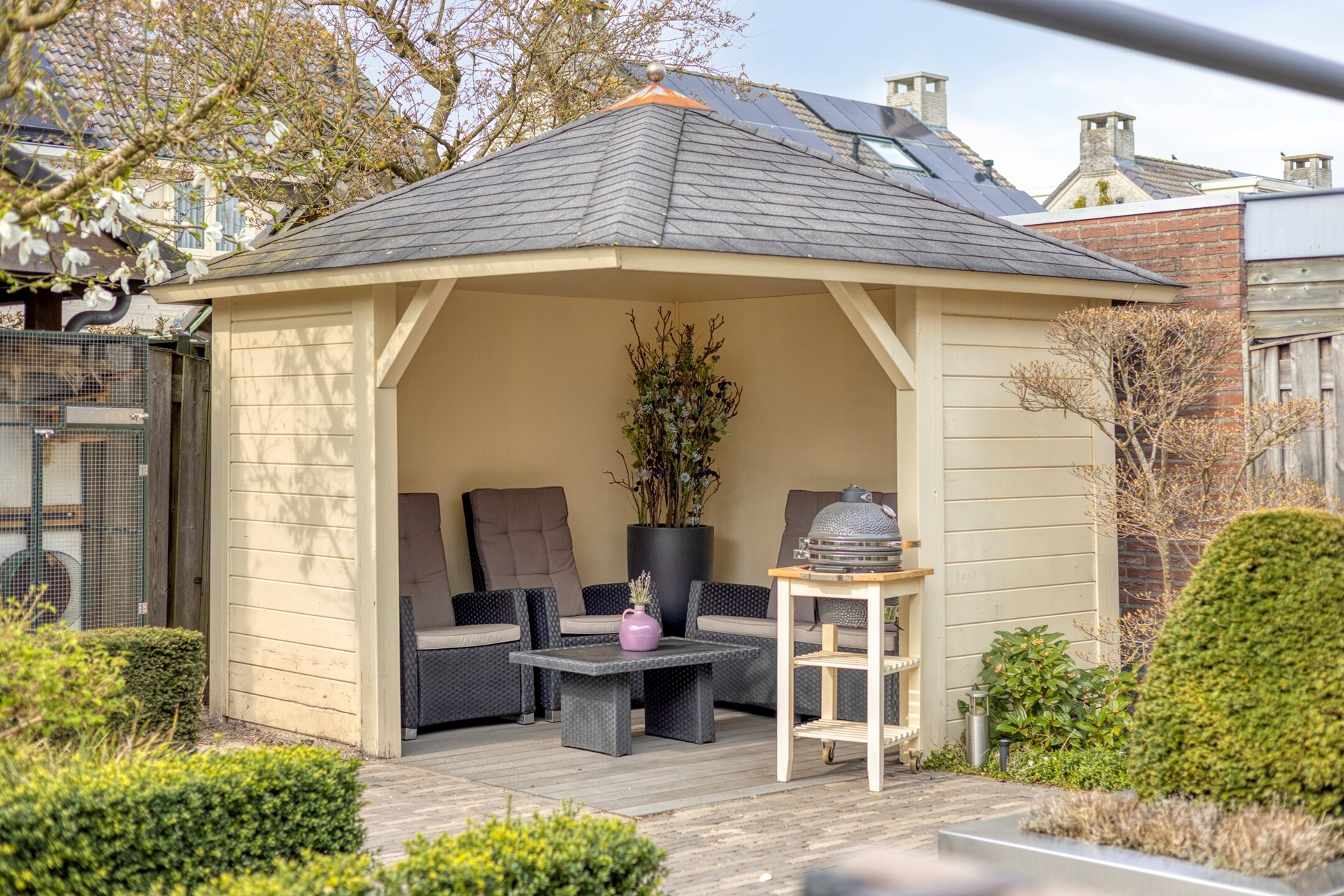 Aan de achterzijde van de tuin bevindt zich een praktische overkapping, ideaal om ook bij minder weer comfortabel buiten te verblijven. Direct aan de woning is een uitschuifbare zonneluifel geplaatst, wat extra comfort biedt op zonnige dagen. Vanuit de tuin is er bovendien directe toegang tot de garage, welke flexibel te gebruiken is voor het stallen van een auto of het opbergen van tuingereedschap, fietsen en andere spullen.