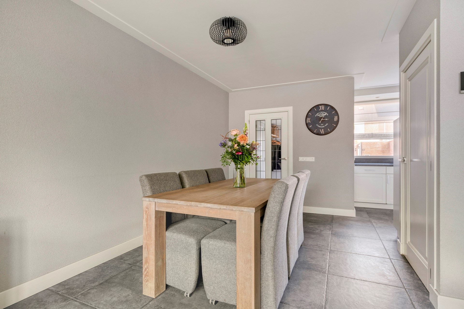 De begane grond kenmerkt zich door een praktische indeling en een hoog wooncomfort. Via de hal heeft u toegang tot een handige berging, een modern toilet en de ruime L-vormige woonkamer. De lichte tegelvloer is voorzien van comfortabele vloerverwarming. Zowel de woonkamer als de keuken zijn afgewerkt met fraai stucwerk op de wanden en plafonds, uitgevoerd met strak lijstwerk. Vanuit de woonkamer zorgt een schuifpui voor een directe verbinding met de zonnige achtertuin. De halfopen, moderne keuken is efficiënt opgesteld in een hoek en beschikt over diverse inbouwapparatuur, waaronder een cooker, vaatwasser, inductiekookplaat, combi-oven, afzuigkap en koelkast.