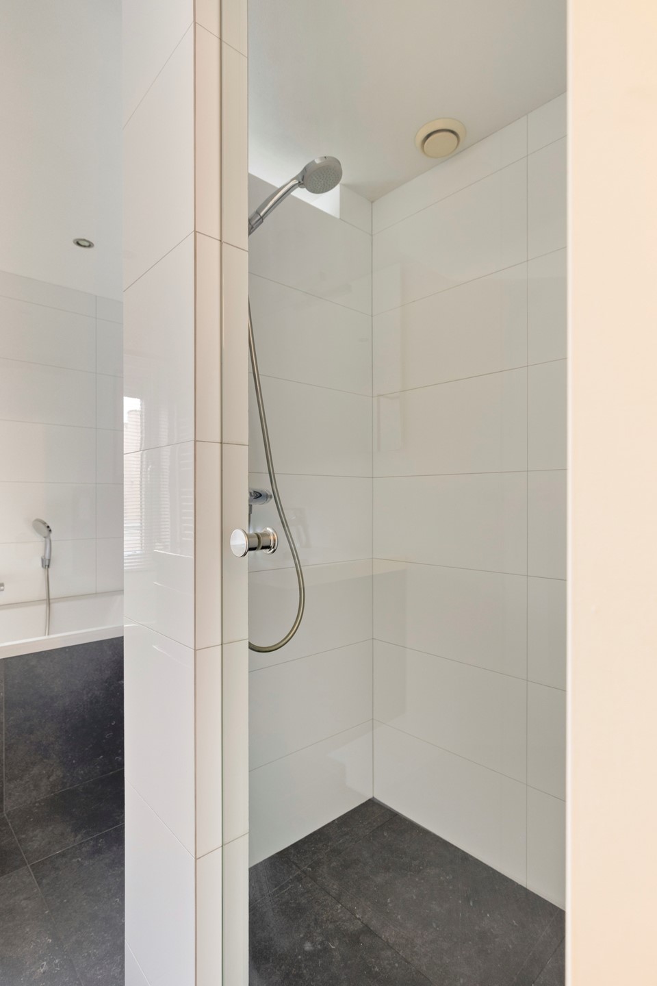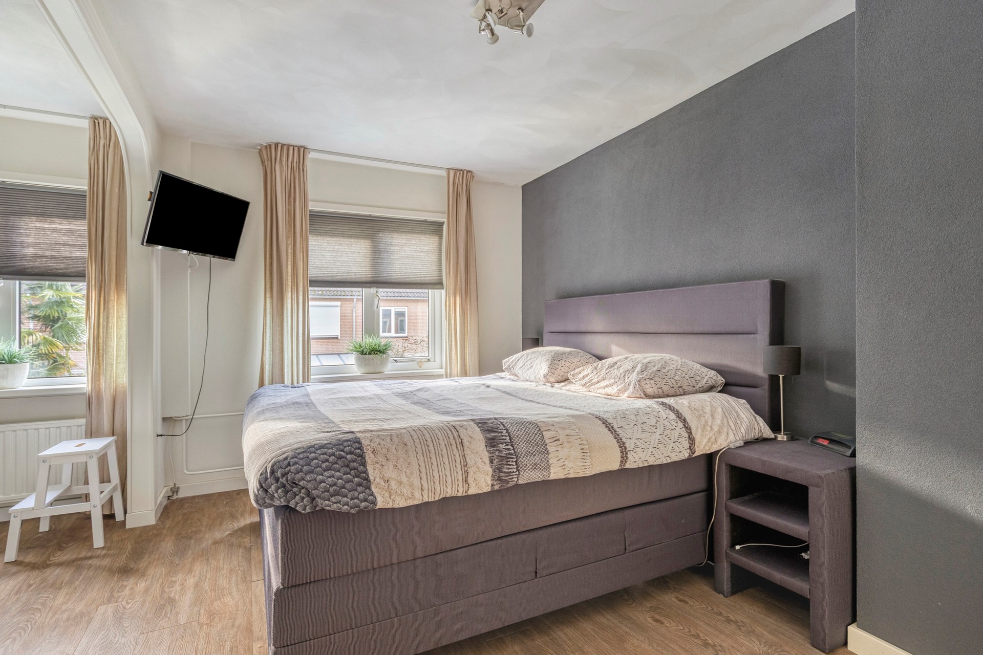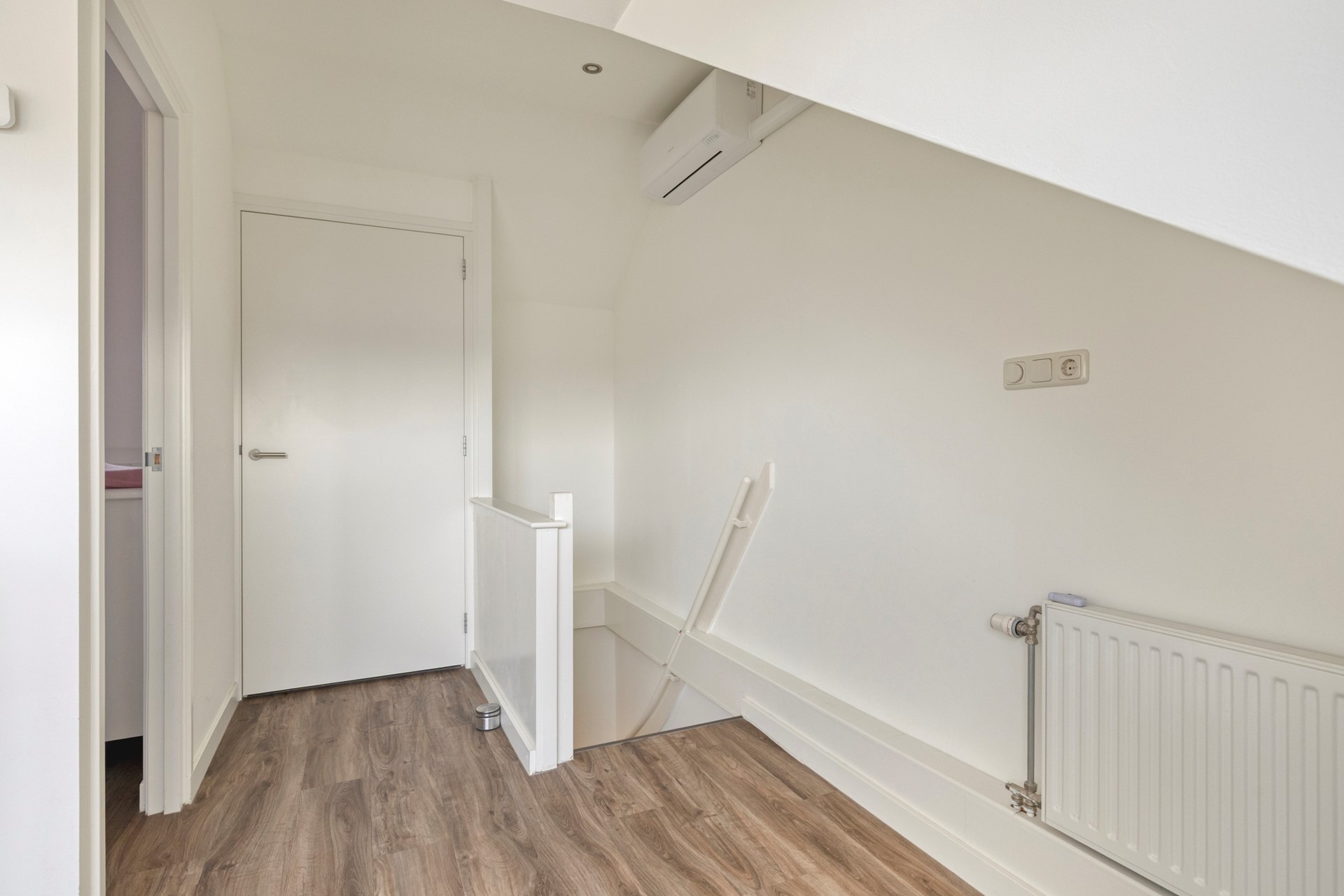 Op de eerste verdieping bevindt zich een overloop met airconditioning, die toegang biedt tot twee lichte slaapkamers (voorheen drie). Beide kamers zijn afgewerkt met een nette pvc vloer en voorzien van rolluiken. De royale hoofdslaapkamer is ontstaan door het samenvoegen van twee kamers, maar kan eenvoudig weer worden teruggebracht naar de oorspronkelijke indeling met twee afzonderlijke slaapkamers. De moderne, volledig betegelde badkamer is stijlvol ingericht en beschikt over een inloopdouche, een wandcloset, een wastafelmeubel en een designradiator. Daarnaast zorgt de comfortabele vloerverwarming voor extra warmte en comfort.