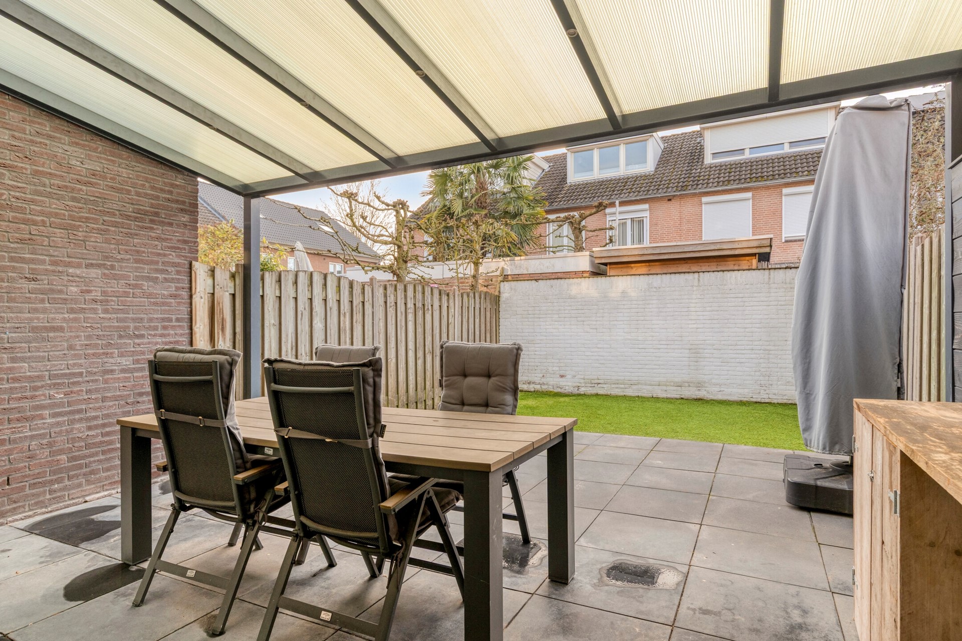 De achtertuin is onderhoudsvriendelijk aangelegd, grotendeels bestraat en voorzien van kunstgras. Door de gunstige zuidwestelijke ligging kan men hier de gehele dag van de zon genieten. Direct aan de woning bevindt zich een overkapping, die het mogelijk maakt om ook bij minder goed weer comfortabel buiten te verblijven.