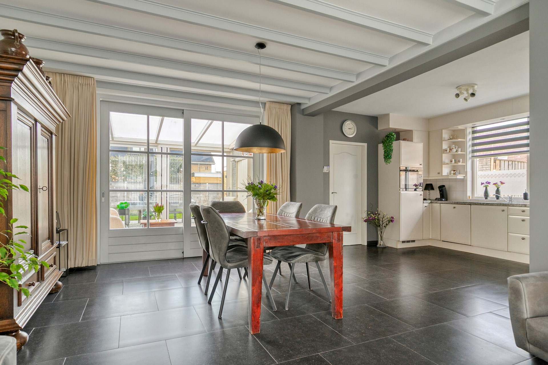 Via de ruime en uitnodigende hal, voorzien van meterkast en trapopgang naar de eerste verdieping, betreedt u de woning. De moderne tegelvloer met vloerverwarming loopt door over de gehele begane grond en draagt bij aan optimaal wooncomfort. De royale L-vormige woonkamer is heerlijk licht dankzij de grote raampartijen en biedt volop ruimte voor zowel een comfortabele zithoek als een ruime eethoek. Aansluitend bevindt zich de tuinkamer, een fijne verlenging van de leefruimte, die dankzij de schuifpui een mooie verbinding vormt met de tuin. De woonkamer staat in open verbinding met de ruime keuken, uitgevoerd in een praktische U-opstelling met veel kastruimte. De keuken is compleet ingericht en voorzien van diverse inbouwapparatuur, waaronder een combi-oven, vaatwasser, inductiekookplaat, afzuigkap en koelkast – ideaal voor kookliefhebbers en gezinnen. Vanuit de keuken heeft u toegang tot de functionele bijkeuken, welke extra bergruimte biedt, is voorzien van een toilet met wandcloset en fontein en toegang geeft tot de verzorgde achtertuin.